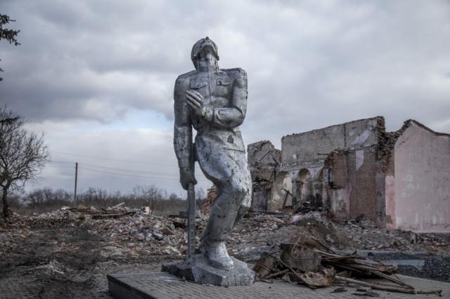 АВТОР ФОТО,GETTY IMAGES Підпис до фото, Радянський пам’ятник загиблому воїну біля зруйнованих будинків у Новоселівці Першій біля Авдіївки